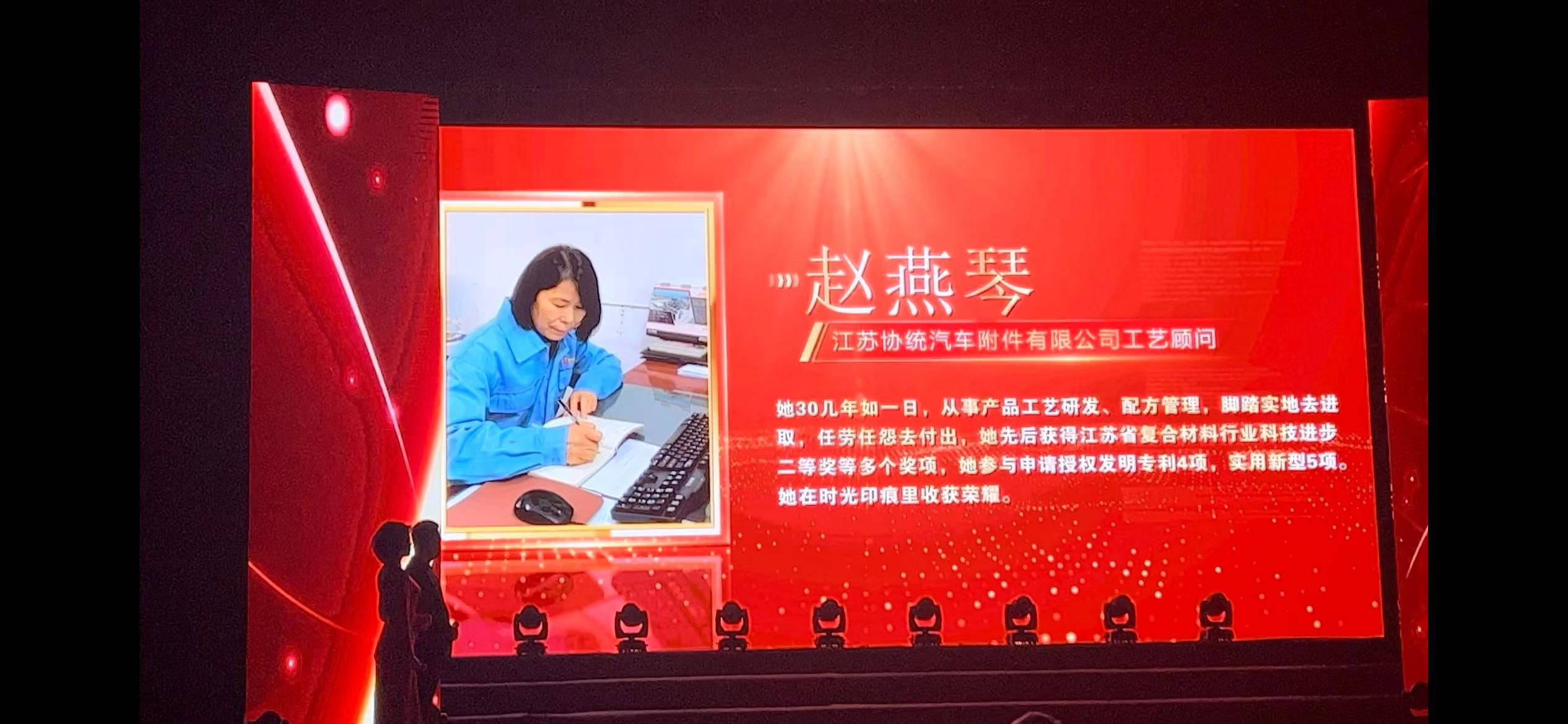 其次,我司工藝顧問(wèn)趙燕琴榮獲"巾幗科創(chuàng)之星獎(jiǎng)”,她三十幾年如一日,從事產(chǎn)品工藝研發(fā)、配方管理,腳踏實(shí)地去進(jìn)取,任勞任怨去付出。還先后獲得江蘇省復(fù)合材料行業(yè)科技進(jìn)步二等獎(jiǎng)等多個(gè)獎(jiǎng)項(xiàng)。她參與申請(qǐng)授權(quán)發(fā)明專(zhuān)利4項(xiàng)、實(shí)用新型5項(xiàng)。她在時(shí)光印痕里收獲榮耀。